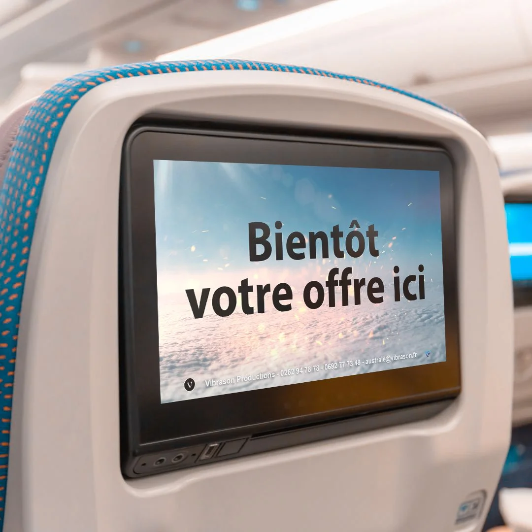 Diffusion imposée de votre spot de 20 à 30 secondes à l’aller et au retour, en exclusivité sur les écrans individuels, avant les vidéos de votre choix* sur tous les vols long-courriers : Réunion/Paris et Mayotte/Paris